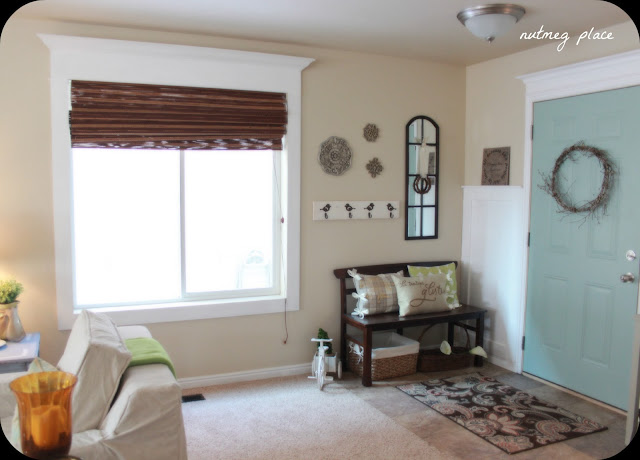 I finally got around to painting the moulding I added to the back door and reattaching the tie backs.