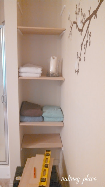 Came home from work, cut my pieces of quarter round (attached to the wall and actually hold the shelf up) got my measuring tape, level and nail gun.